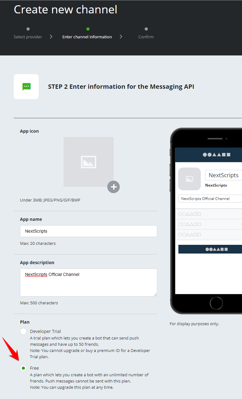 7. Please enter the Bot/App/Chanel Name, description, select categories. Please choose “Free” plan.