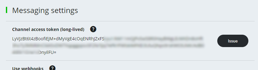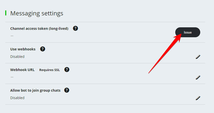 11. Scroll down to “Messaging settings”. Click “Issue” to the “Channel access token (long-lived)”.