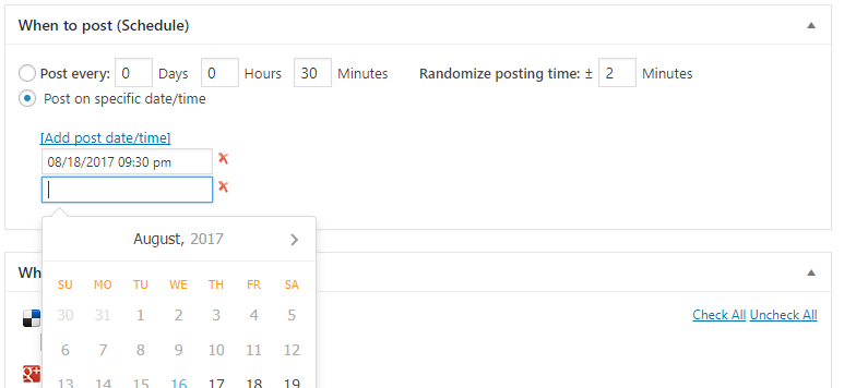 – [Pro Only] When to post: “Post on specific date/time” – you can set specific dates and times for reposts. This is useful when you need to repeat some post several times at specific times.