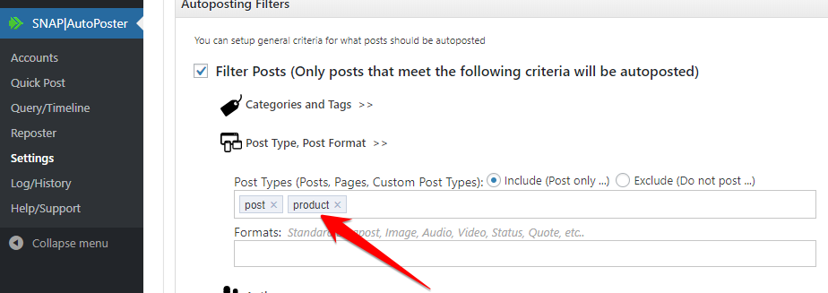 Technically WooCommerce product is whats called WordPress custom post type. So first thing that you need to do is to add custom post type “product” to the list of post types that SNAP should autopost.