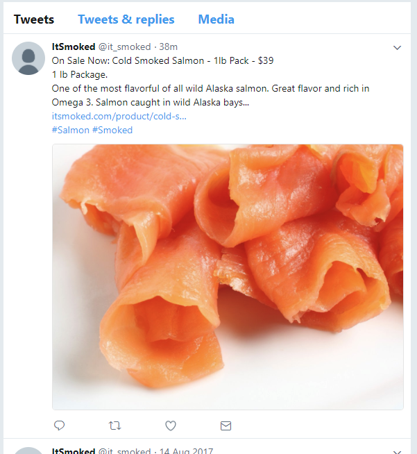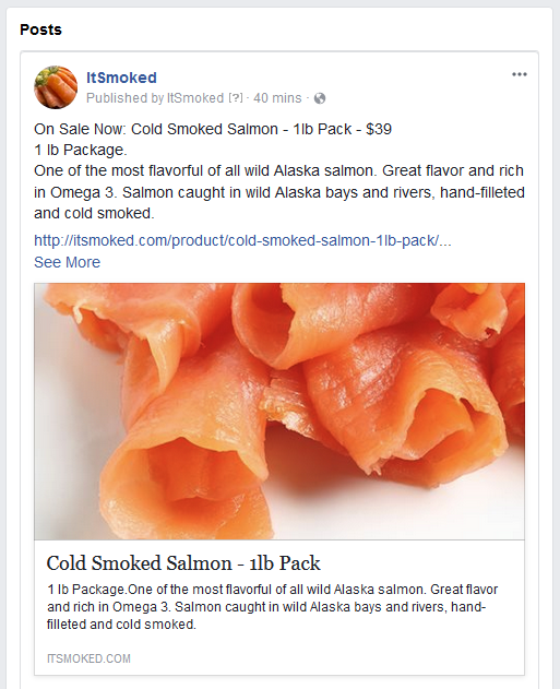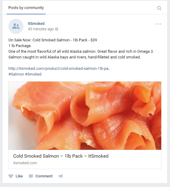 Something more complicated – Product title with sale price, short description, URL and product tags posted as hashtags.